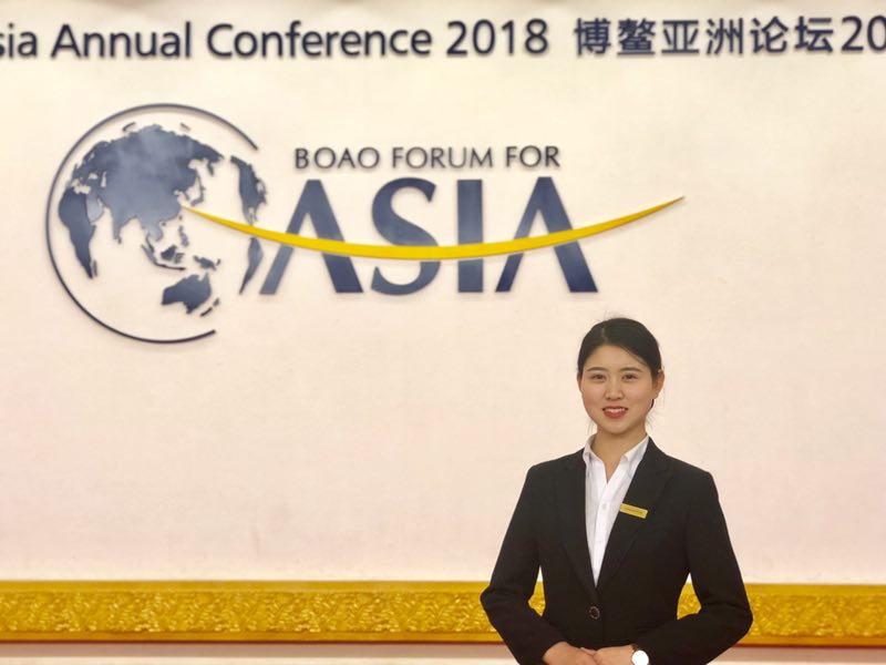 罗悦雅,1507091,亚洲博鳌会志愿者,谈及此次志愿者服务,她说:三江入海处,博鳌夺世眼。仲春的海南,世界目光聚焦在这里,作为年会的工作人员,很高兴以翻译志愿者的身份服务参会的各国嘉宾代表。年会期间,我的职责是为西餐部的嘉宾们提供翻译相关服务。年会开始前,我们进行了种类繁多的西餐礼仪培训、商务礼仪培训等等,这边的培训专业性强,要求很高,餐饮服务人员在服务过程中需要全程保持站姿,所以站姿和微笑训练也是我们的重点点培训之一,也正是因为有这些训练经历,我才能够出色的完成服务大型活动的任务。政商文艺界的名流齐聚博鳌。参与法国前总理拉法兰的晚宴经历尤为难忘,无论是晚宴的开始前的准备和对接工作,亦或是晚宴期间的翻译服务,都要求专业性,不能出任何差错,客人们都都肯定了我们的⼯作,当秘书Lina感谢我们的服务时,再多的⾟辛苦和疲惫也一扫而空。另一重要任务是,为“博鳌之夜”主题晚会提供翻译服务,国宴级别的晚会,每位参与人员都代表着国家形象,带着这样一种使命感,我们圆满完成了任务,工作之余还有幸近距离目睹王毅部长的风采,压轴演讲令在场的所有嘉宾和工作人员热血沸腾,心潮澎湃。当然也有幕后的日夜奋战,年会的餐饮分类繁杂,菜单的翻译任务很繁重。我和伙伴们一起,加班加点,翻译、校对、定版、跟进,充分体验的翻译的取舍之难,上学期王中心老师的《实用文体翻译》介绍了餐饮翻译的技巧,对翻译菜单有很大帮助,我也在这个过程中重新新认知了餐饮类的翻译技巧以及校对查证。博鳌亚洲论坛立足于亚洲而不仅局限于亚洲,五洲四海的宾朋⻬聚于此, 共商发展大计,是亚洲之幸,世界之幸;参与年会,是我的荣幸。