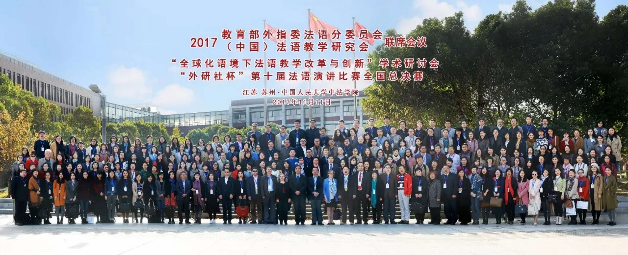 11月11日,2017年(中国)高校法语年会在苏州召开,外国语学院卢悦和王然老师一同参加了此次会议。年会由教育部外指委法语分委员会、(中国)法语教学研究会主办,中国人民大学苏州校区承办,持续3天,主要有“全球化语境下法语教学改革与创新”学术研讨会、“外研社杯”第十届法语演讲比赛全国总决赛等多项重要活动。