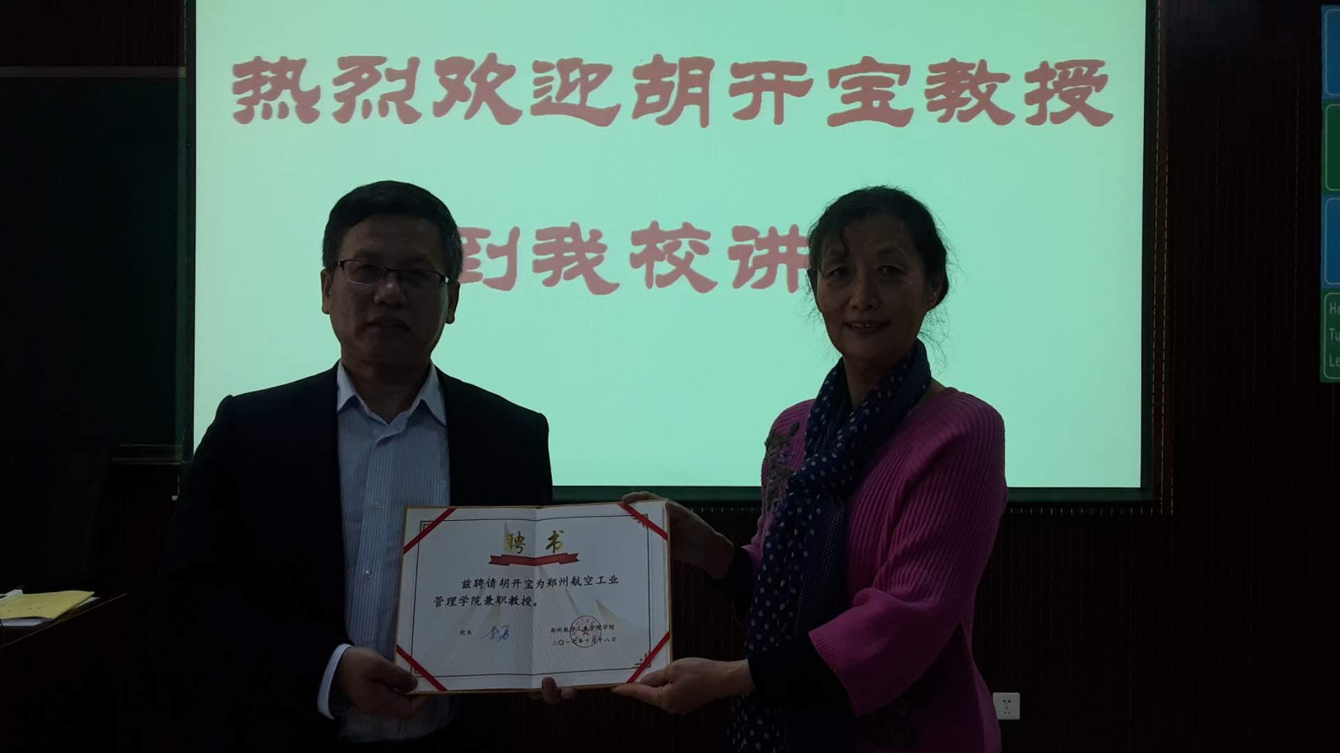10月25日下午,郑州航空工业管理学院兼职教授聘任仪式在02A403举行,上海交通大学外国语学院院长胡开宝教授受聘为我校外国语学院外国语言文学学科兼职教授,副校长王霞出席聘任仪式并为其颁发了聘书。聘任仪式结束后,胡教授做了题为《语料库在翻译研究中的应用》的学术讲座,让师生们受益匪浅。