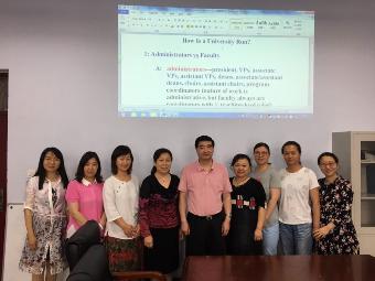 2017年5月11日下午2:30—4:30,在05C506举行了一场题为“美国大学教学质量监控体系研究”的讲座。主讲人是我校外国语学院客座教授,美国Ferris州立大学终身功勋教授丁丹雄博士,外语学院的领导和部分教师听取了这场讲座。