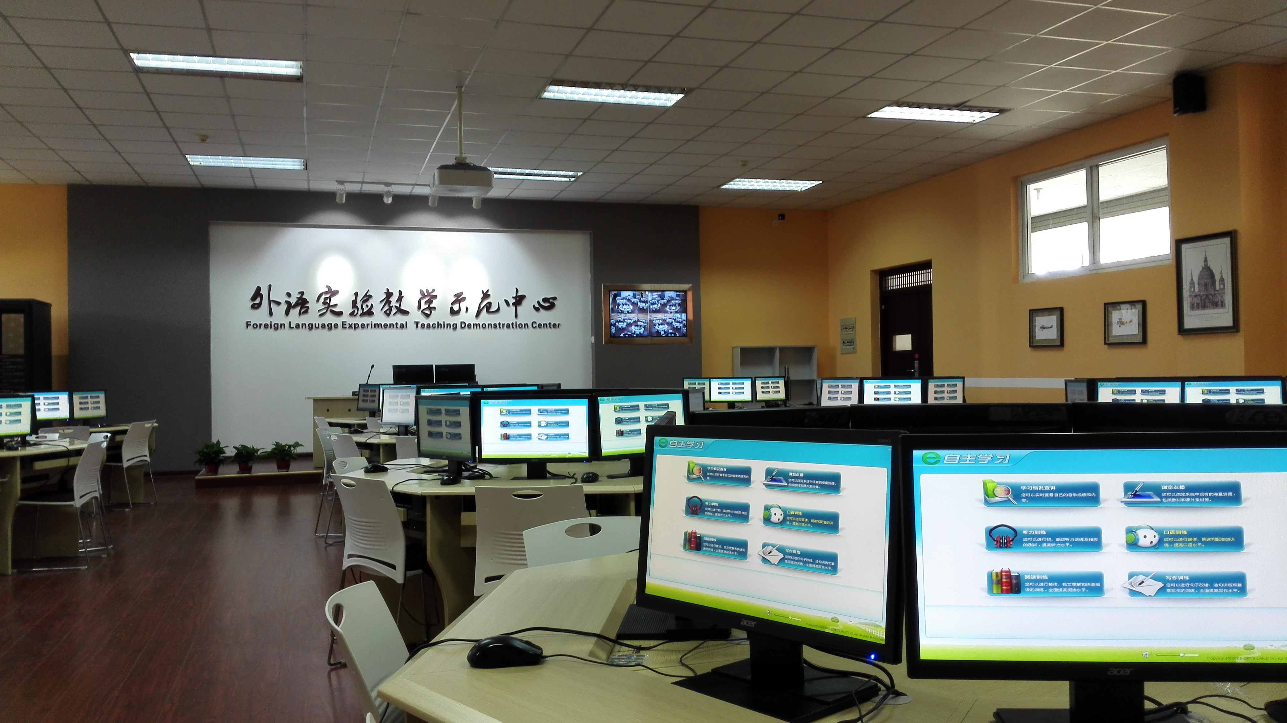 云网络数字化语音实验室建设项目2016年7月立项,在学校领导的关心和支持下,经过实验室与设备管理处、资产处、教务处和外国语学院的共同努力,通过多轮专家论证、严格按照政府招标采购等程序于2017年5月初建设完成,本项目包含:云网络语音实验室6间(424座)、商务英语实训平台1个及网络英语写作智能批改平台1个。