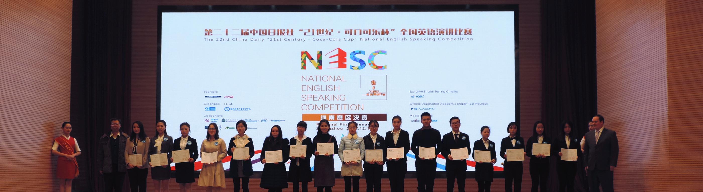 12月18日上午8:30,第二十二届中国日报社“21世纪•可口可乐杯”全国英语演讲比赛河南赛区决赛于郑州航空工业管理学院(以下简称:郑州航院)图书馆第一报告厅成功举行。此次全国英语演讲比赛由中国日报社主办,郑州航院承办。参加此次比赛的评委及嘉宾有:郑州航空工业管理学院副院长贺金社、郑州航空工业管理学院教务处处长颜敏、河南大学外国语学院院长高继海、郑州航空工业管理学院外国语学院院长郭银玲、解放军外国语学院基础部主任张金生、郑州大学外国语学院副院长索成秀、河南师范大学外国语学院副院长张志强、中原工学院外国语学院副院长杨道云、Nathan Suchomel,同时郑州航院三百余人到场观看比赛。