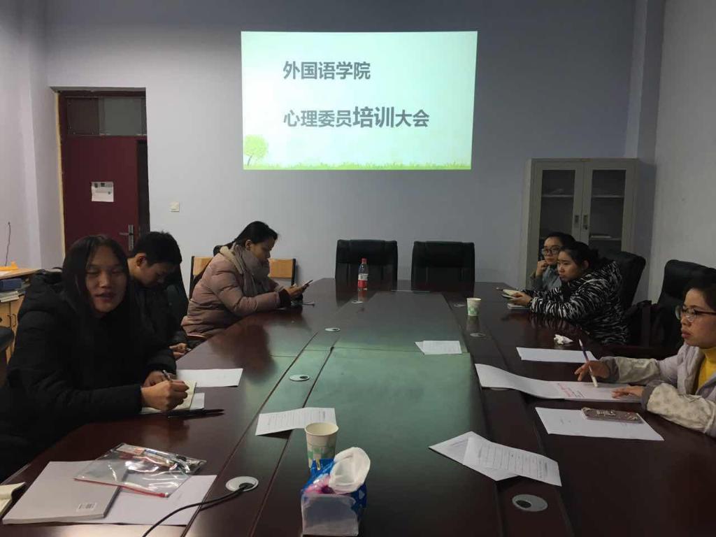 12月12日下午3:00,外国语学院2016级心理健康教育培训会在05C516会议室顺利召开。我院党总支副书记耿三琳、2013级辅导员王高迪老师、2014级辅导员付昊老师以及2016级全体班级心理委员参加此次会议。