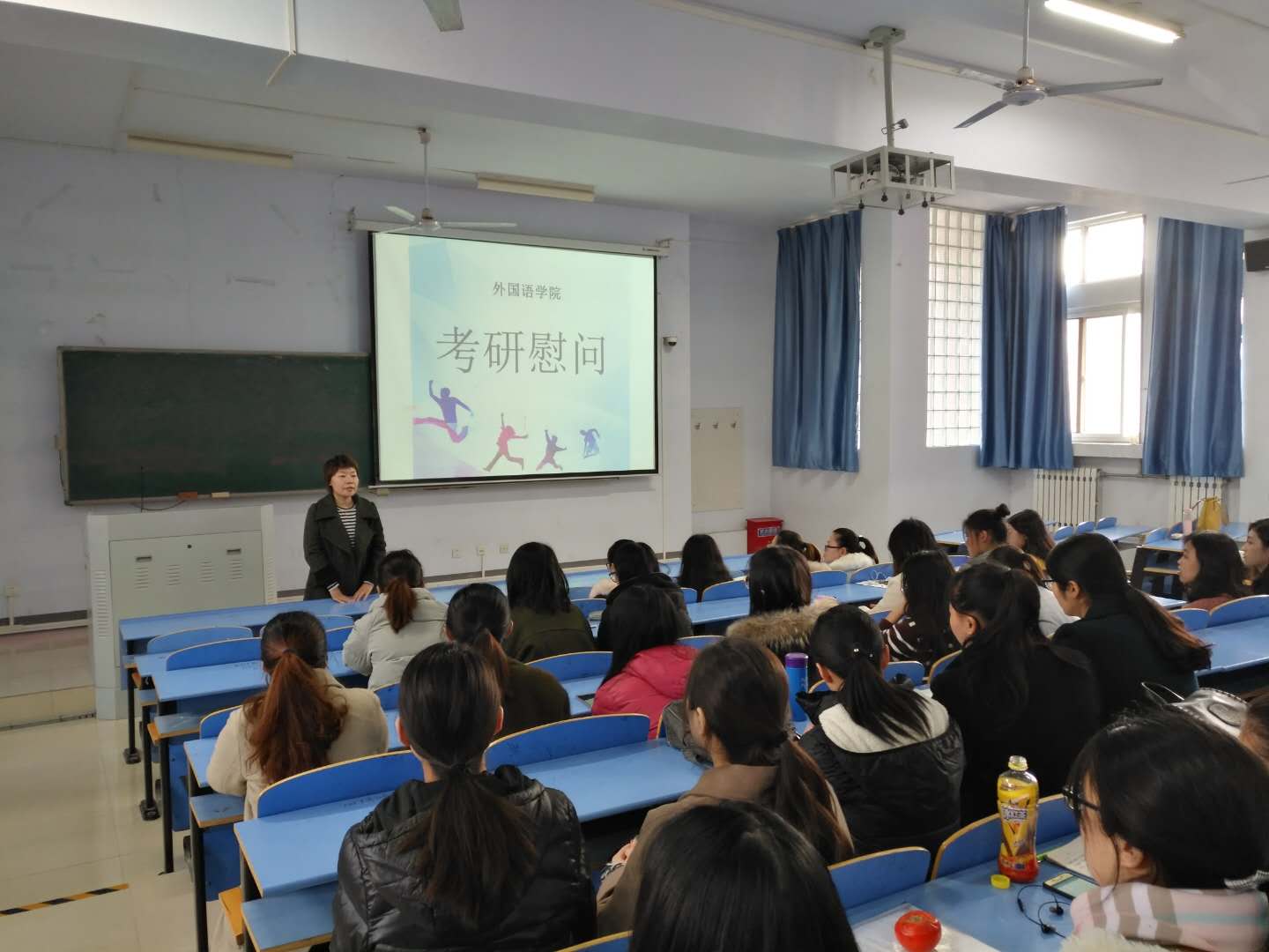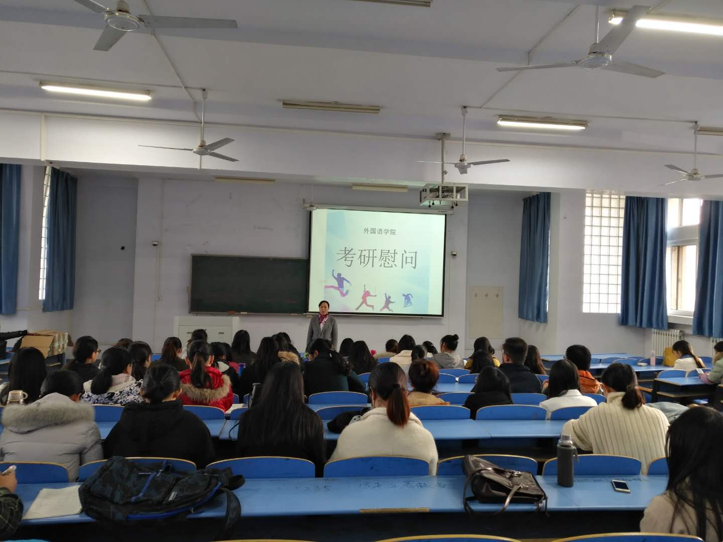 11月28日下午3:00,外国语学院考研慰问大会于05B301教室成功举办。本次大会由2014级辅导员付昊老师主持,外国语学院院长郭银玲、党总支副书记耿三琳出席本次大会,我院备战考研的100余名学生到场参与。