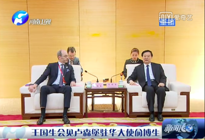 王国生书记代表河南政府对俞博生一行来豫参加第十二届中国(河南)国际投资贸易洽谈会表示欢迎,对4月16日举行的卢森堡旅游签证(郑州)便捷服务平台揭牌仪式给予祝贺,表示河南坚决落实习近平主席重要指示精神,支持郑州——卢森堡“空中丝绸之路”项目,全面融入“一带一路”建设,豫卢合作空间很大,希望俞博生大使能再来,常来。俞博生提出豫卢高层领导互动频繁,希望尽快开通郑卢客运直航,继续加强两方在文化、旅游领域的合作。