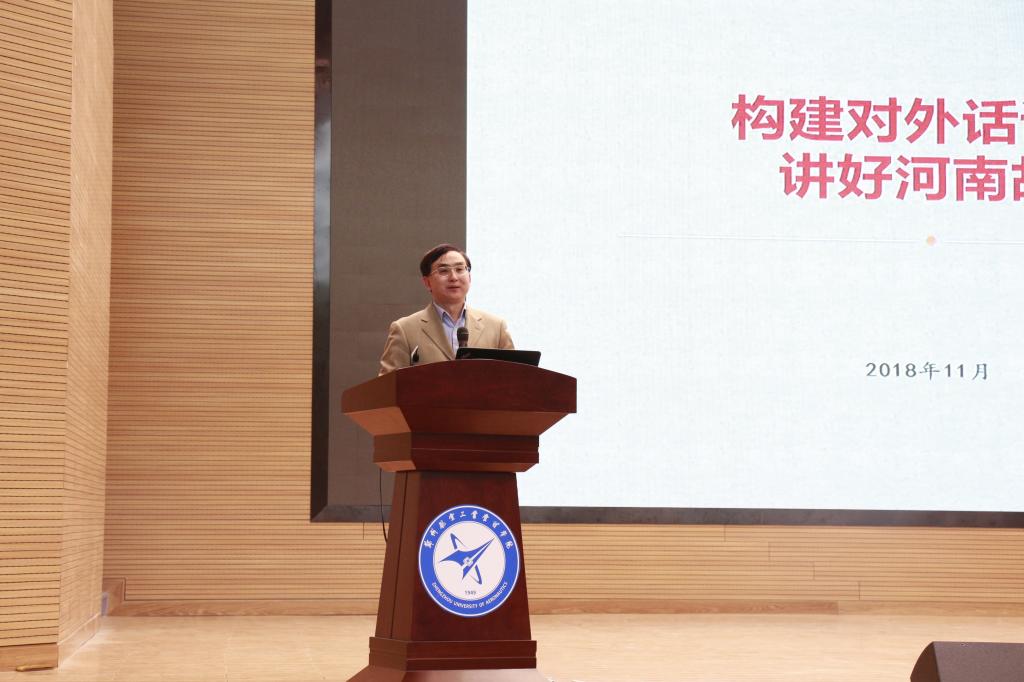 开幕式后,杨玮斌主任作题为“构建对外话语体系,讲好河南故事”的讲座,他从服务一带一路建设出发,引出如何讲好河南故事,宣传好河南。他对参与模联活动的学生表示赞扬,鼓励学生关注国际形势,关注外交发展动态。以“用英语的方式讲好英语”结语,表达对一代新青年的强烈企盼。