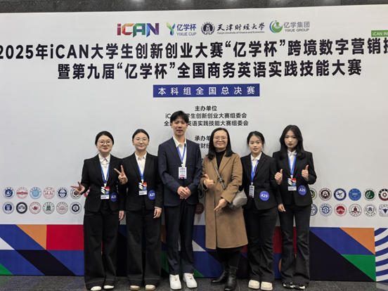 近日,2025年ICAN创新创业大赛“亿学杯”跨境数字营销挑战赛暨第九届“亿学杯”全国商务英语实践技能大赛本科组全国总决赛在天津财经大学顺利举行。由我校教师高睿指导,刘行健、贺函璇、陈江曼、郭赏、袁玥五位同学组成的代表队,凭借扎实的专业知识、出色的实践能力和良好的团队协作,在比赛中表现优异,最终荣获全国总决赛本科组三等奖。