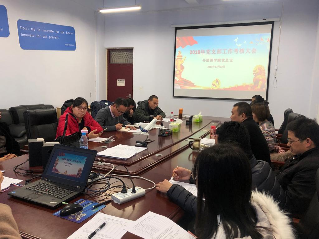 为认真贯彻落实党的十九大精神、加强党的基层组织建设,2018年12月18日下午,外国语学院党总支于05c516会议室召开了2018年度基层党支部书记抓党建述职评议会议,学院总支委员、支部书记、教师代表和学生代表参加了本次会议,会议由党总支书记许峰主持。