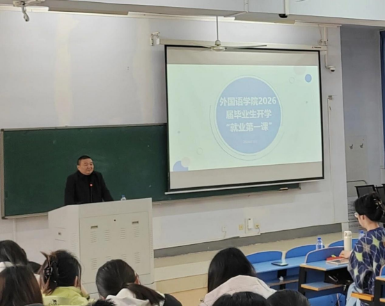 外国语学院于3月23日在05C201为2026届毕业生举办“就业第一课”,学院党委书记许峰、党委副书记董利江、就业专员李松月老师以及2022级辅导员仝立鹏老师分别围绕就业升学、安全稳定、政策解读等关键环节展开专题指导。